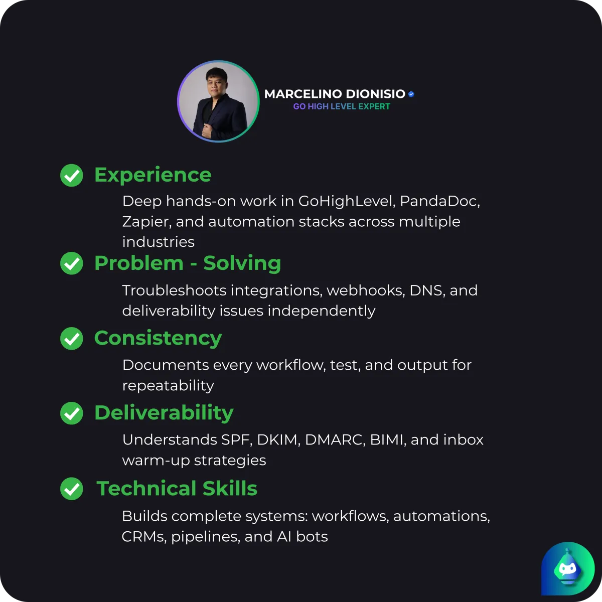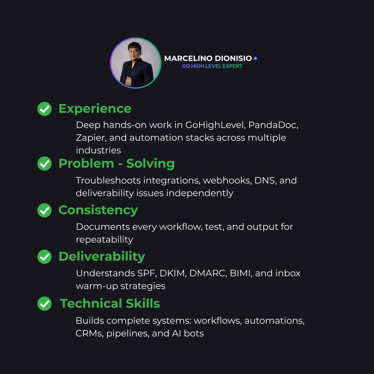 My builds help business owners save time, reduce admin, and scale consistently, with systems doing the heavy lifting.